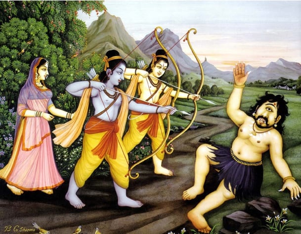 Ravana, el gran antagonista del Señor Rama es una figura contradictoria. Su figura es imponente, con diez cabezas y veinte brazos, con sus espaldas de león, sus colmillos de jabalí, y su rostro grave e imponente, y aún así de porte noble y digno. Maestro en artes mágicas, virtuoso de la música, gran devoto de Shiva, y a la vez enemigo de Rama, lujurioso y arrogante. En occidente resulta a menudo chocante ver que un supuesto demonio puede atesorar tantas virtudes y al tiempo ser la...