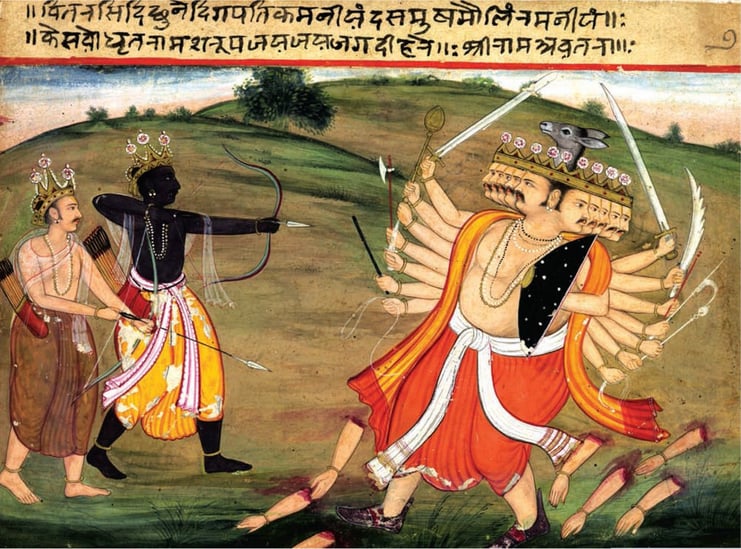Ravana, el gran antagonista del Señor Rama es una figura contradictoria. Su figura es imponente, con diez cabezas y veinte brazos, con sus espaldas de león, sus colmillos de jabalí, y su rostro grave e imponente, y aún así de porte noble y digno. Maestro en artes mágicas, virtuoso de la música, gran devoto de Shiva, y a la vez enemigo de Rama, lujurioso y arrogante. En occidente resulta a menudo chocante ver que un supuesto demonio puede atesorar tantas virtudes y al tiempo ser la...